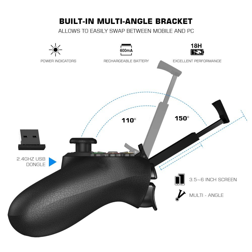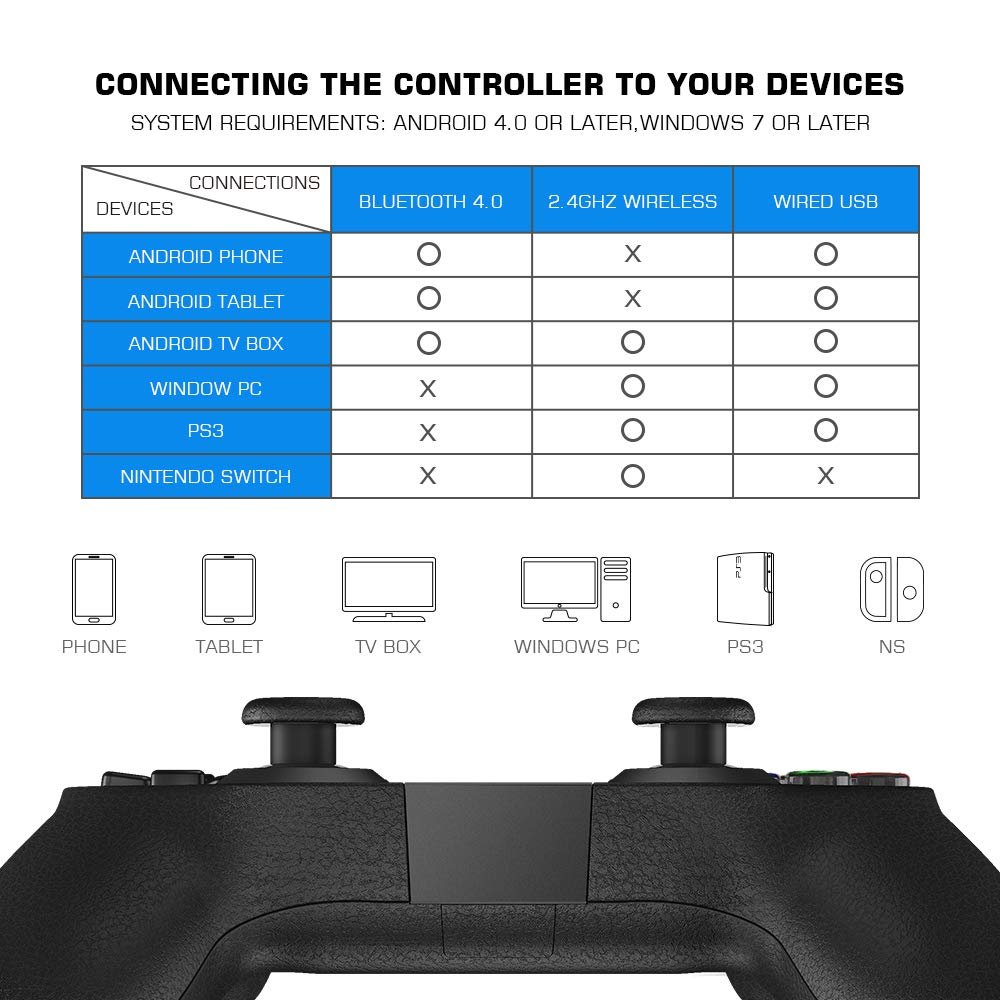 GameSir T1s uses a 32-bit MCU chip with a computing power of up to 48 million times per second. Built-in Realtek Bluetooth 4.0 solution and 2.4GHz wireless module, GameSir T1s has dual wireless connection. It is suitable for Android smartphones and tablets, as well as Windows PC, Steam and PS3, and supports various games.