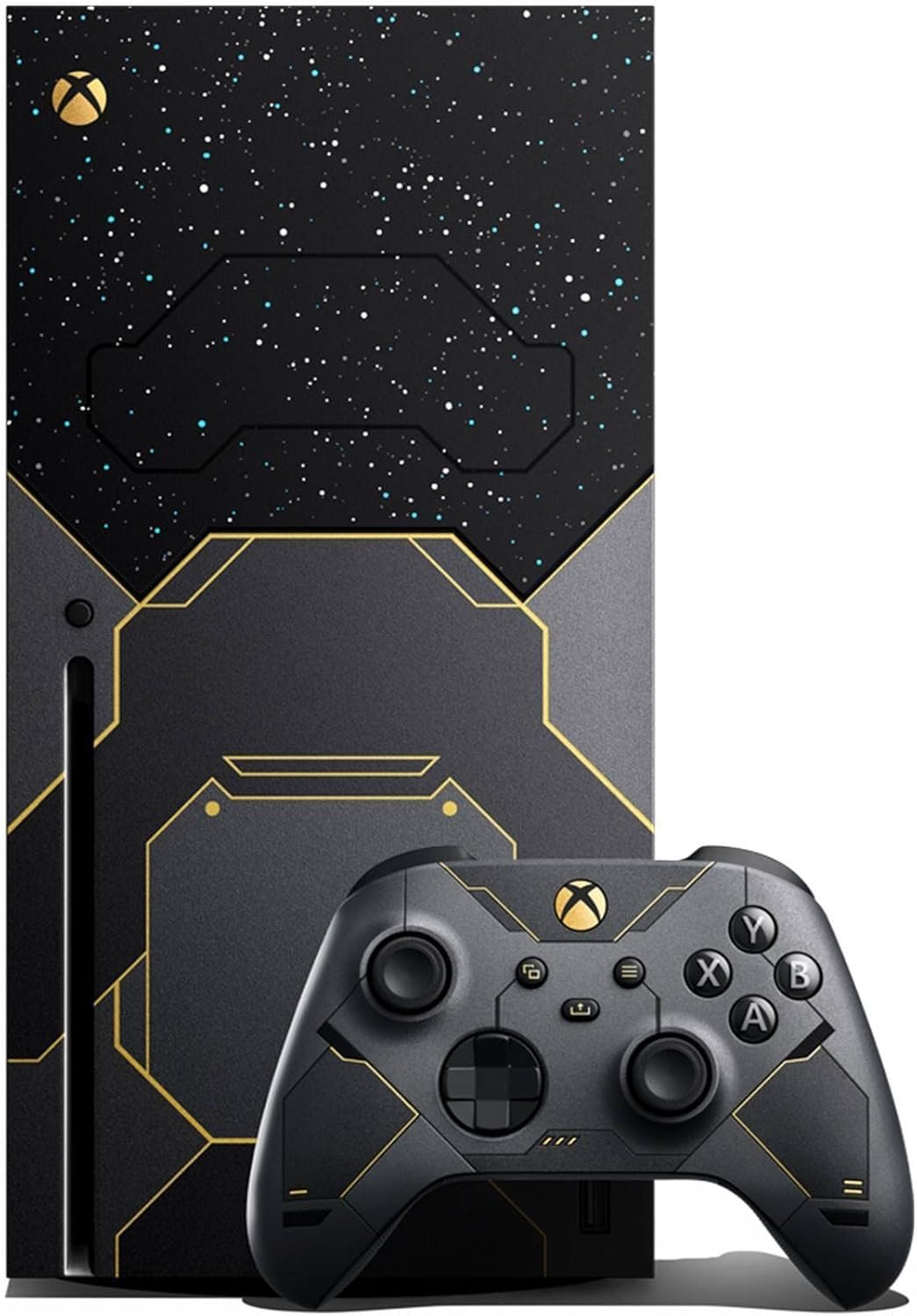 - Includes a custom console design imprinted with stars as seen from the surface of Zeta Halo—extending onto the fan behind a Cortana blue vent. Inspired by the Master Chief’s armor, dark metallic paneling is accented by iridium gold on the console and its matching controller with side and back grips to accommodate all play styles.