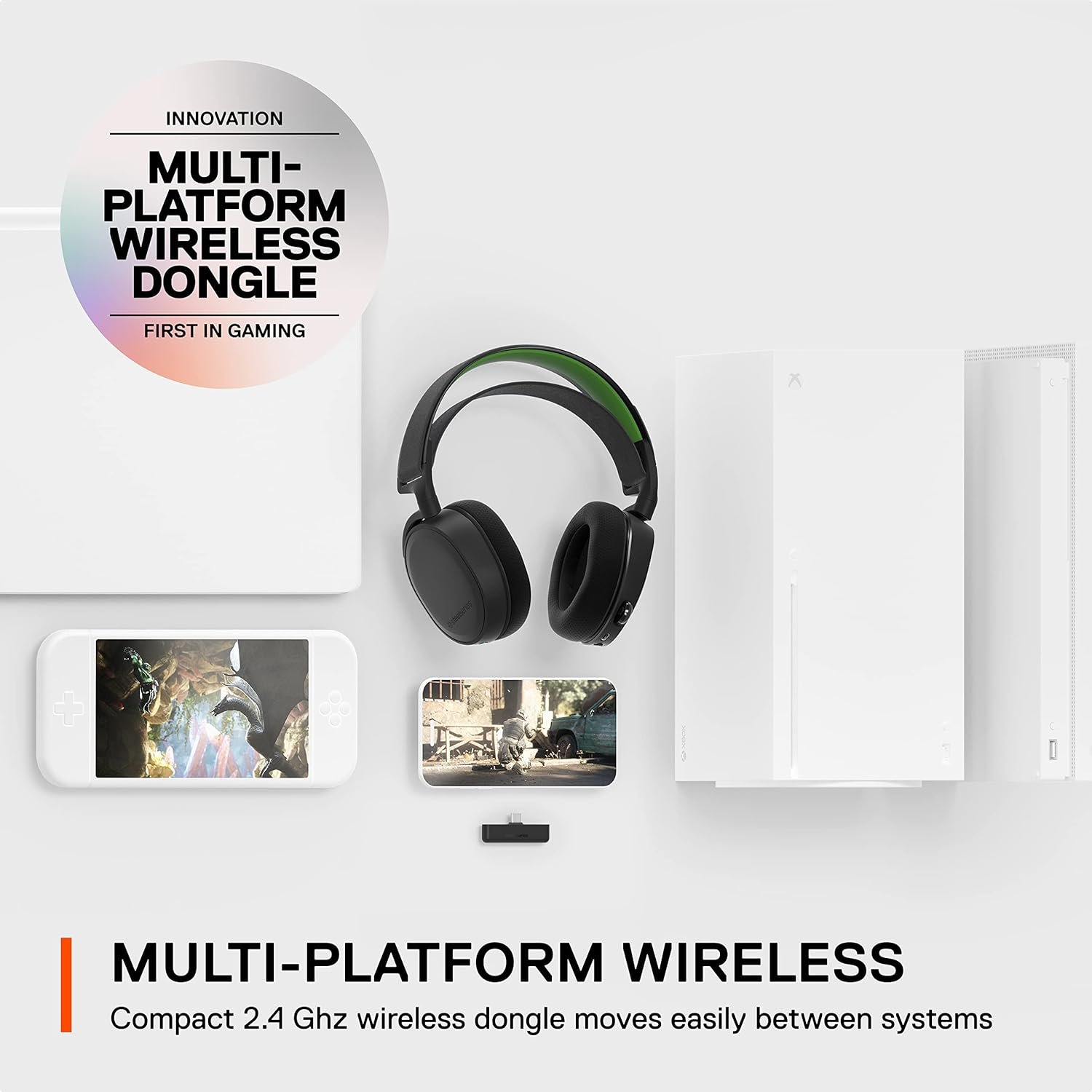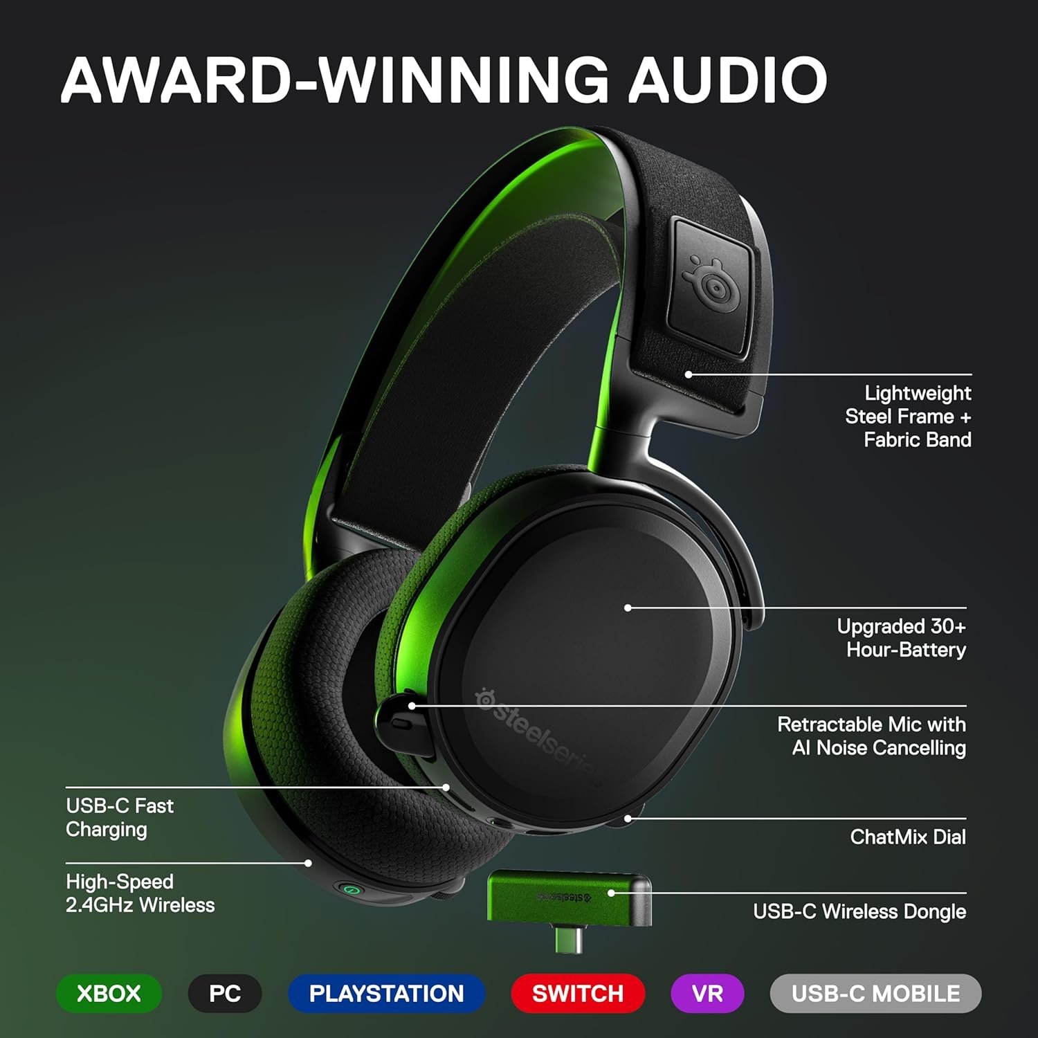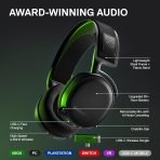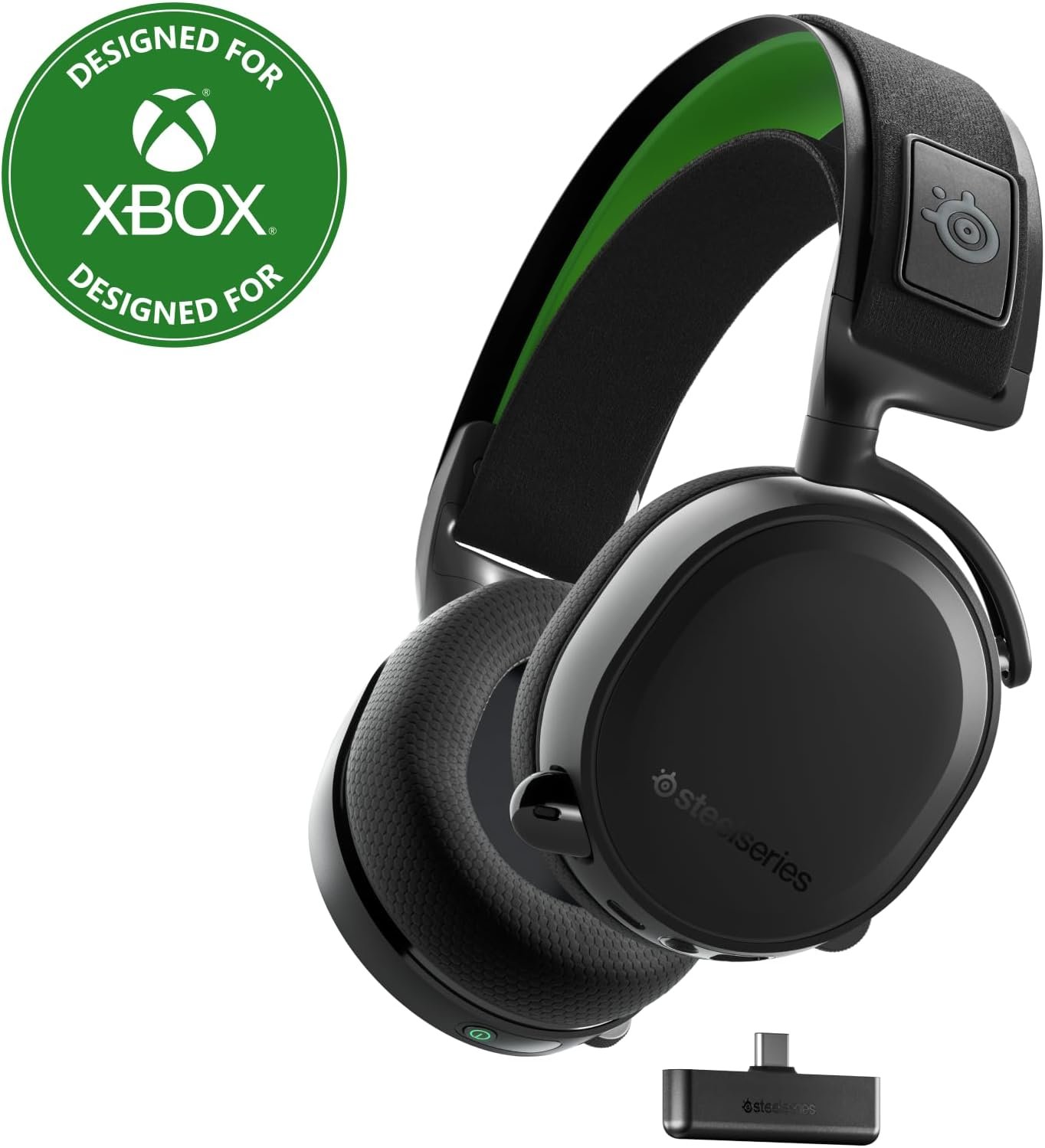 The SteelSeries Arctis 7X+ Wireless headset is designed specifically for Xbox Series X|S with compatibility for Xbox One, PC, PlayStation, Mac, Android, Oculus Quest 2, and Switch. It uses lossless 2.4 GHz wireless audio for ultra-low latency gaming audio via a compact USB-C dongle (USB-A adapter included). It has a 30-hour battery life for nonstop gaming with USB-C charging, easy on-ear headset controls including Chat-Mix, a durable lightweight steel frame, and an adjustable elastic “ski-goggle” style band for a comfortable fit. The Clear-Cast mic – the best in gaming – is also retractable and features an LED mute indicator. Designed Action & Adventure, and EVERYONE